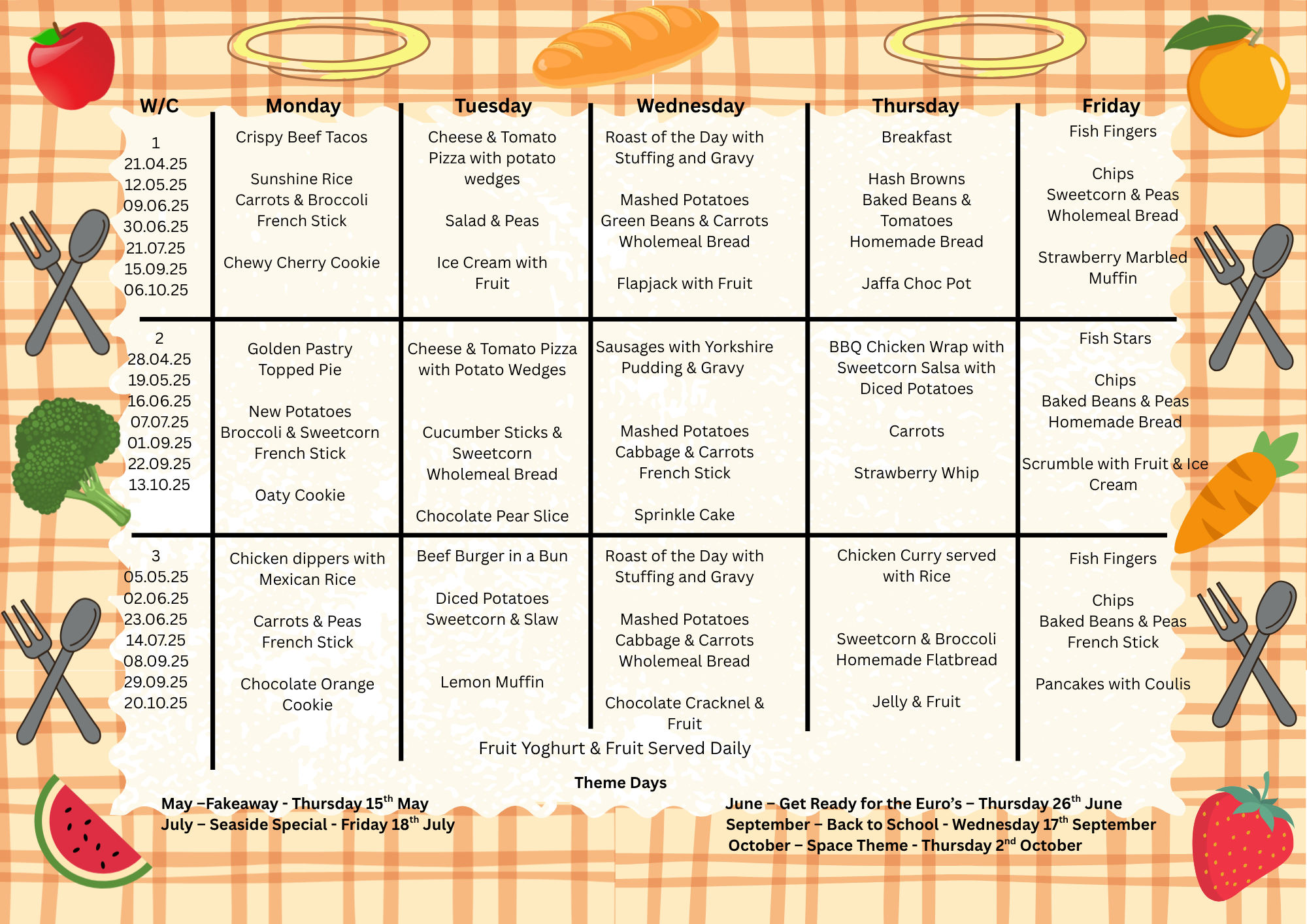 All children who are with us at lunchtime can enjoy a delicious hot meal free of charge. These meals are freshly prepared onsite by our kitchen staff, and all allergies and religious diets are catered for. The Derbyshire Catering Service ensures meals are of a high standard, being nutrionally balanced and sourced from local food suppliers.